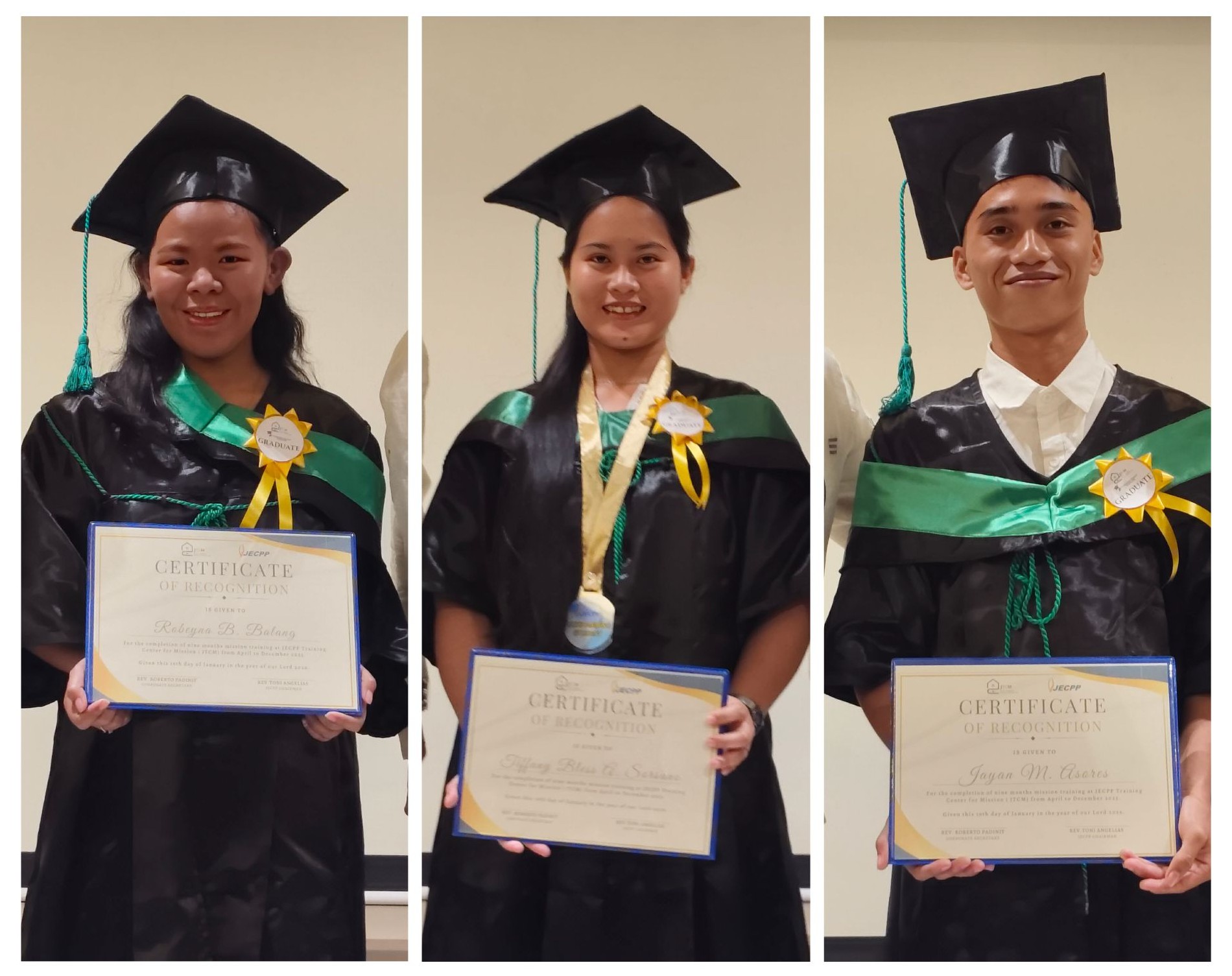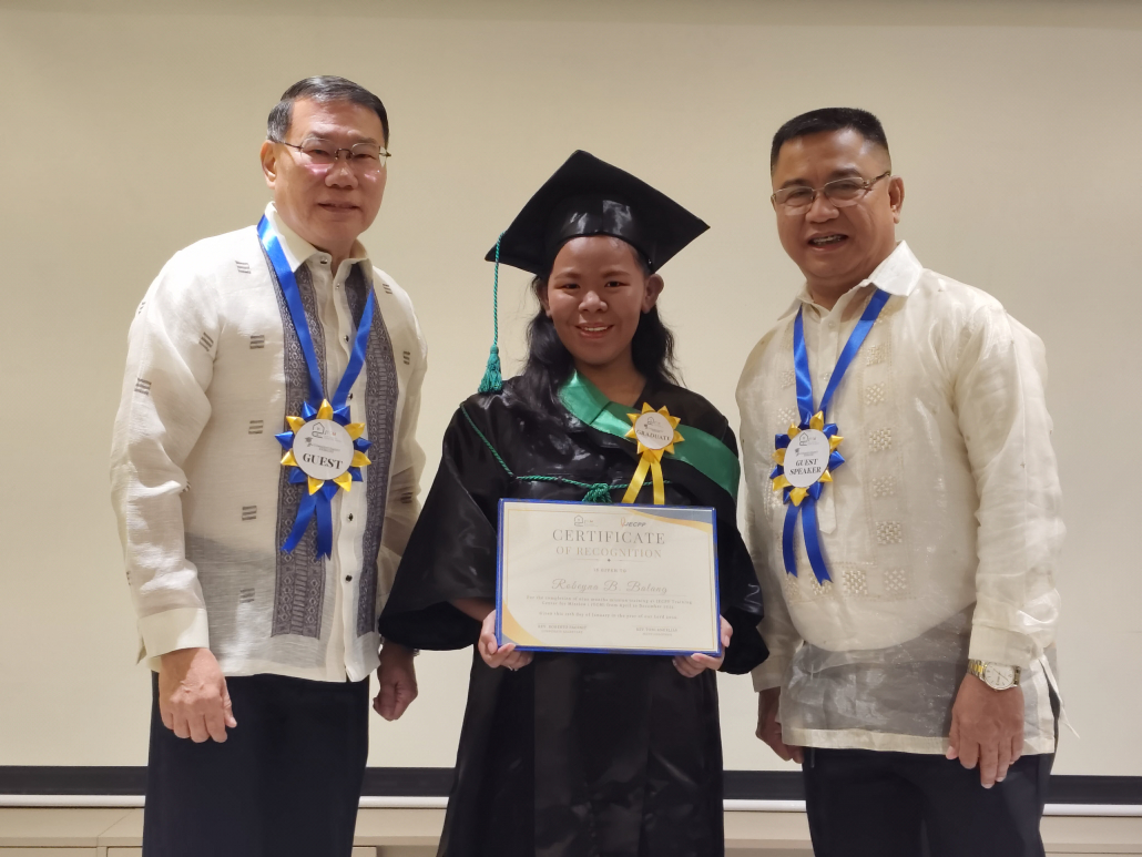 Three dedicated trainees—Tiffany Bless A. Sorsano, Robeyna Bana Balang, and Jayan Mendoza Asores—successfully completed the rigorous nine-month training program. The program was designed to equip them holistically, nurturing spiritual maturity, strengthening character, and preparing them for faithful service in ministry.